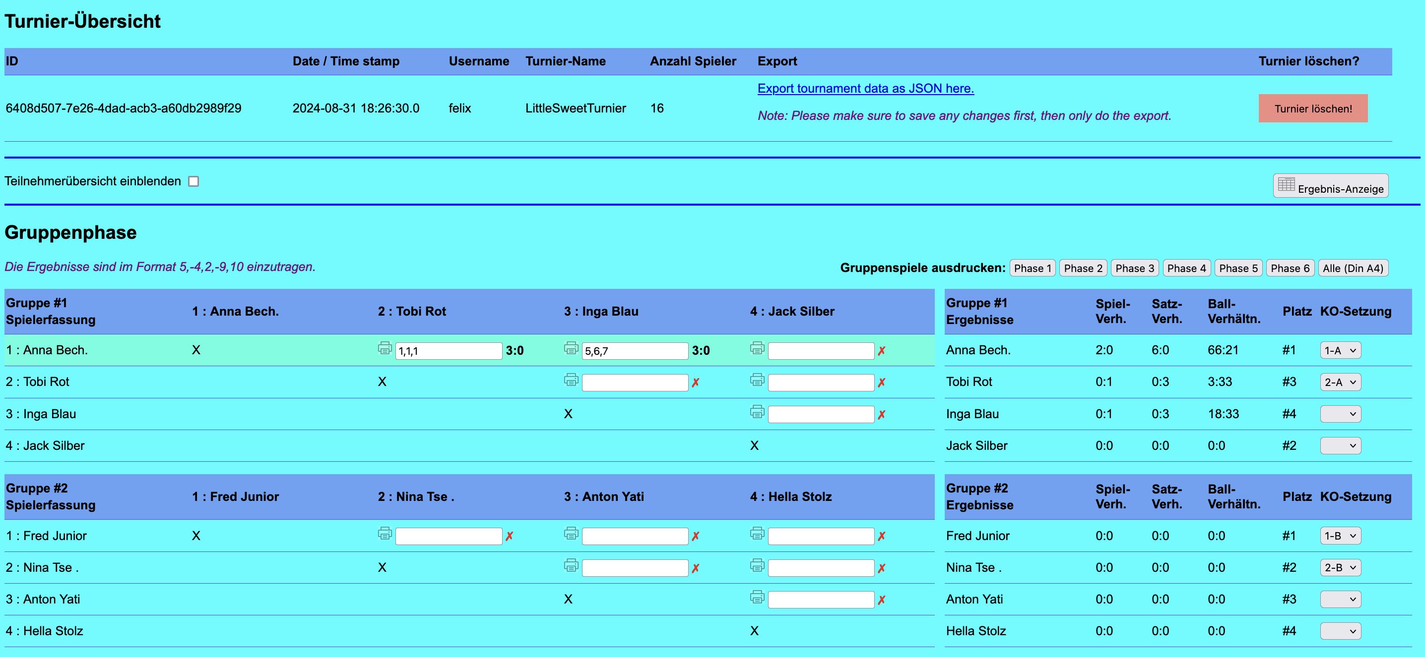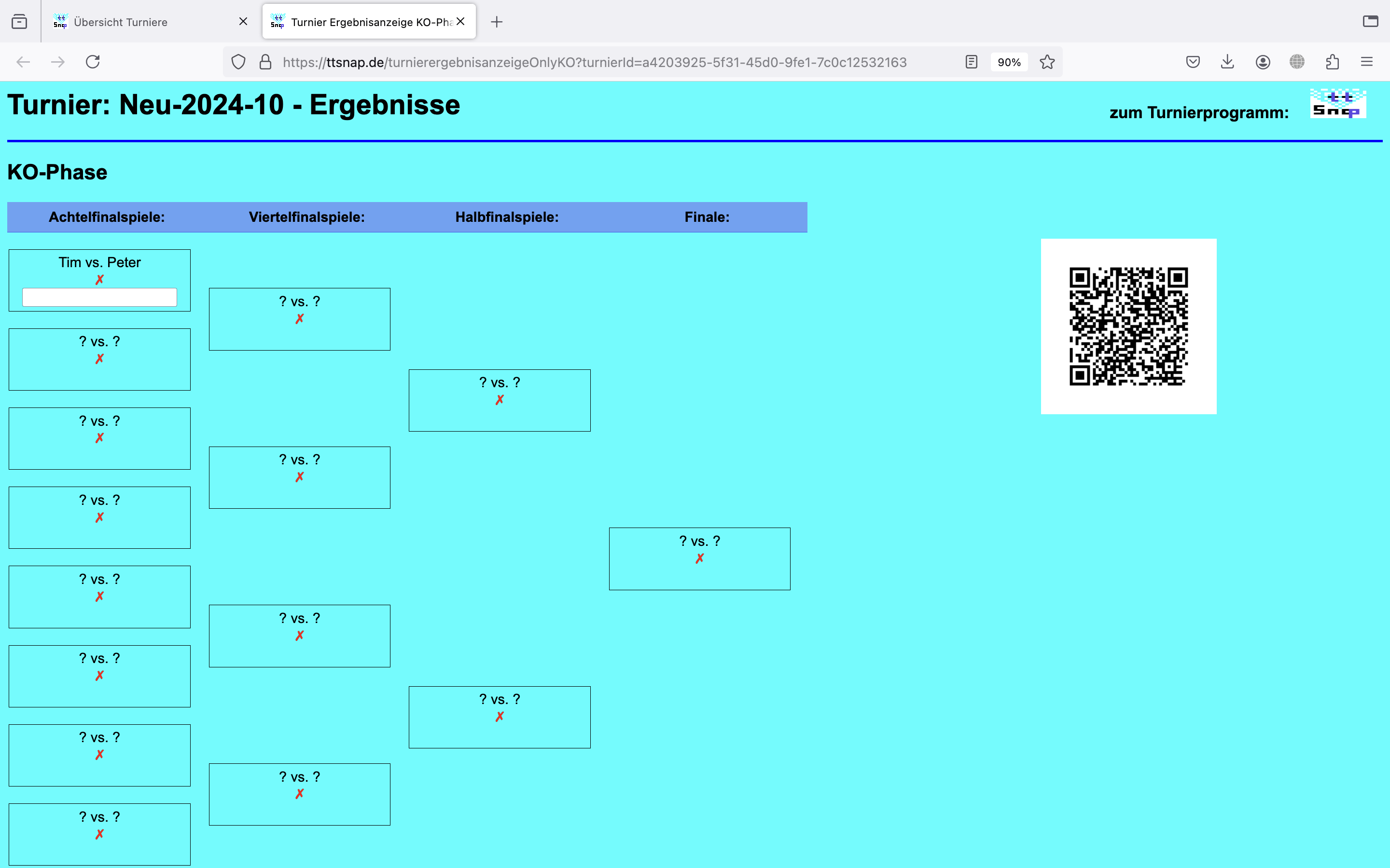 - die Ergebnisanzeige, die öffentlich verfügbar ist und mit Teilnehmern des Turniers per QR-Code geteilt werden kann (links).